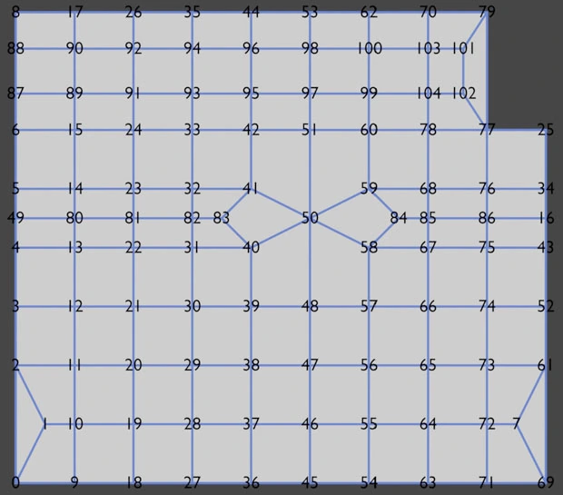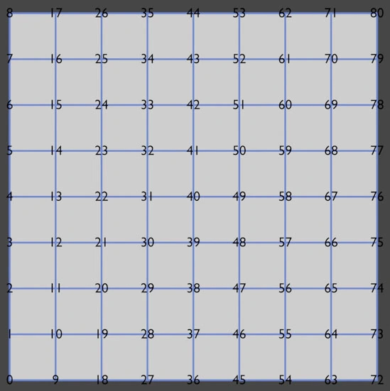 - i.e. increases by 1 or the previous index + number of vertices in a row or column