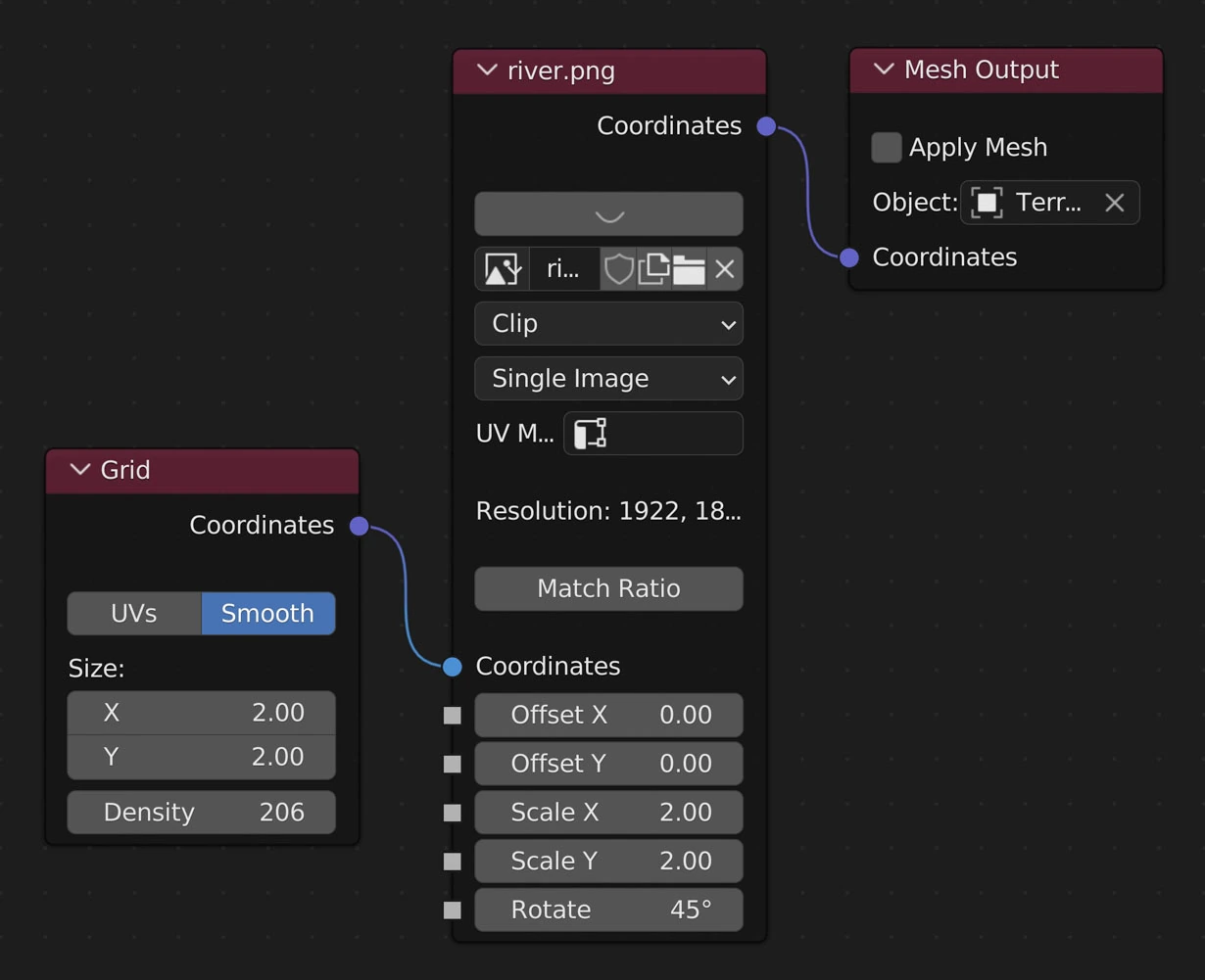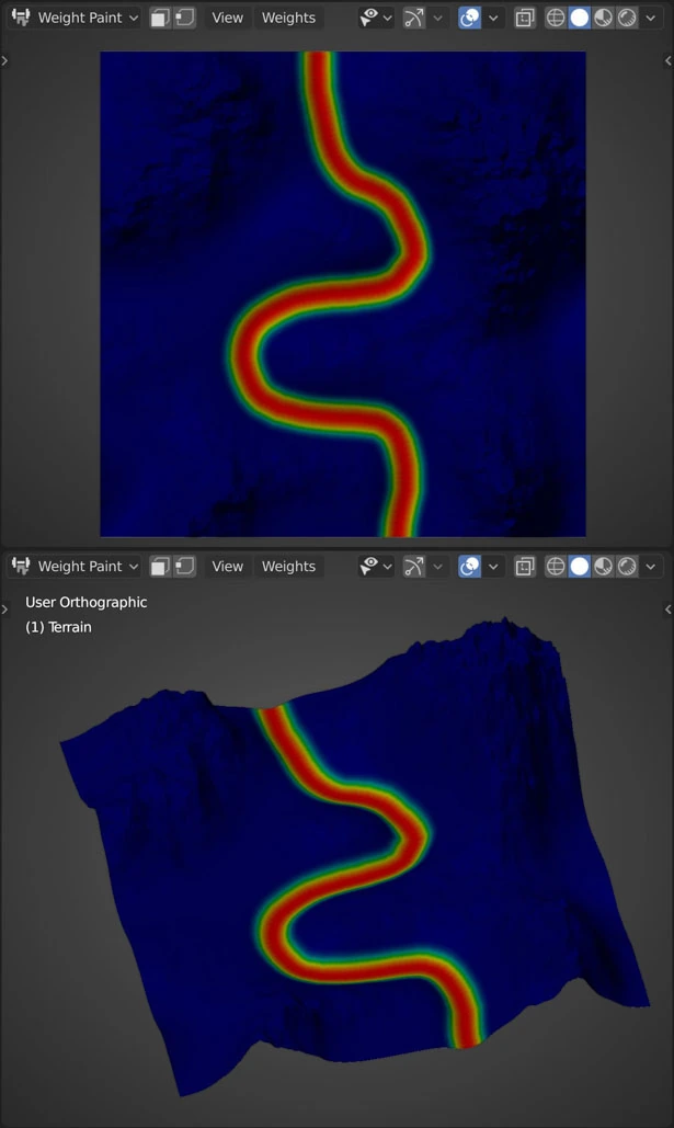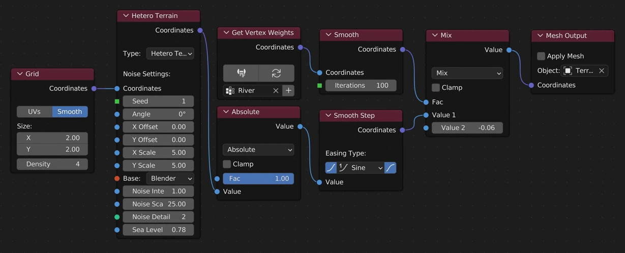 Here we are using a vertex weight map as the Factor to mix between a base value (-0.06) for the river bottom and the terrain (Hetero Terrain node)