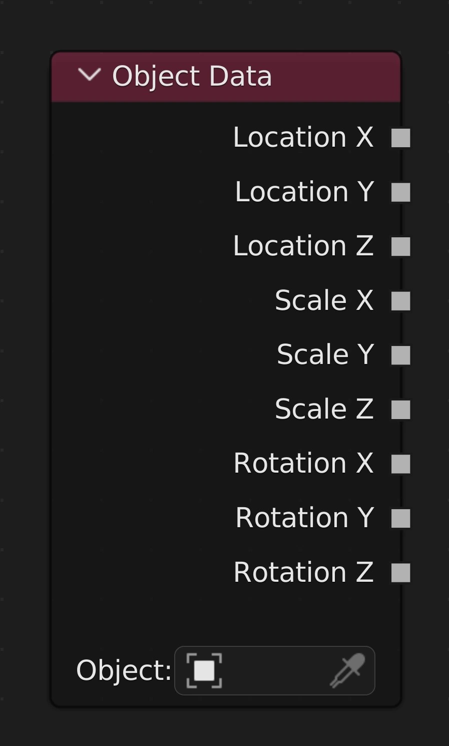 Enables control of properties via an object's transform data. When node is selected and the chosen object is transformed the NodeScapes node tree will update automatically