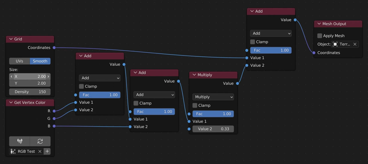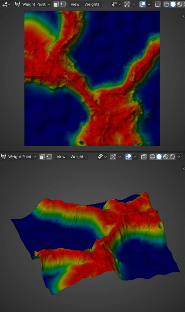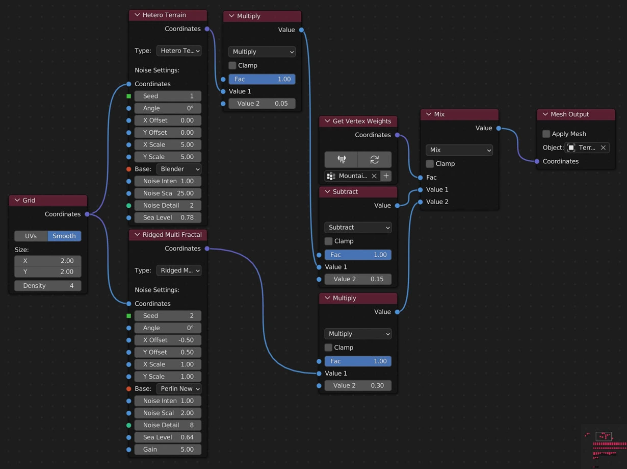 Here we are using a vertex weight map as the Factor to mix between a base landscape (Hetero Terrain node) and a mountainous landscape (Ridged Multi Fractal node)