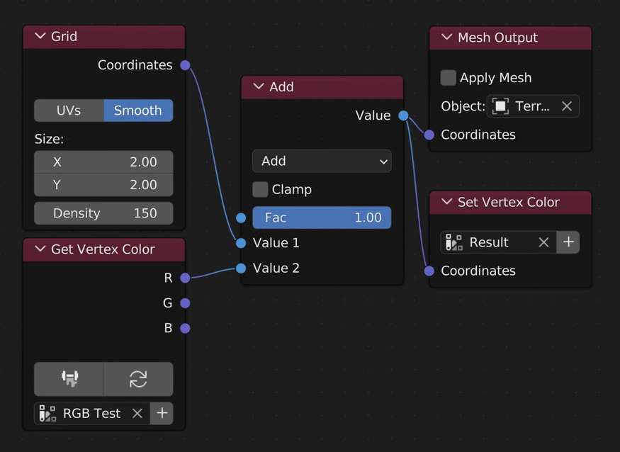 Returns the values from the selected Vertex Color layer. Each color output channel (R, G, B) will be from 0 to 1. Useful for mixing
